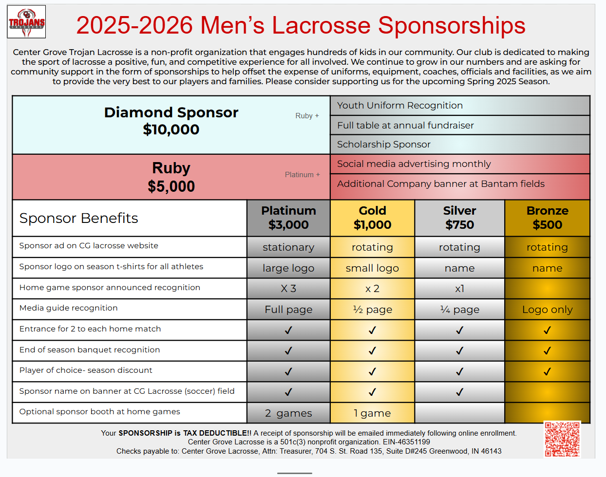Center Grove Lacrosse is a club run by volunteers and your contributions are crucial to our success. Sponsorships are used to pay for facility rentals, bus fees, referees, coach stipends, trainers, field equipment, and much more. Your generosity helps lower the costs for our families.